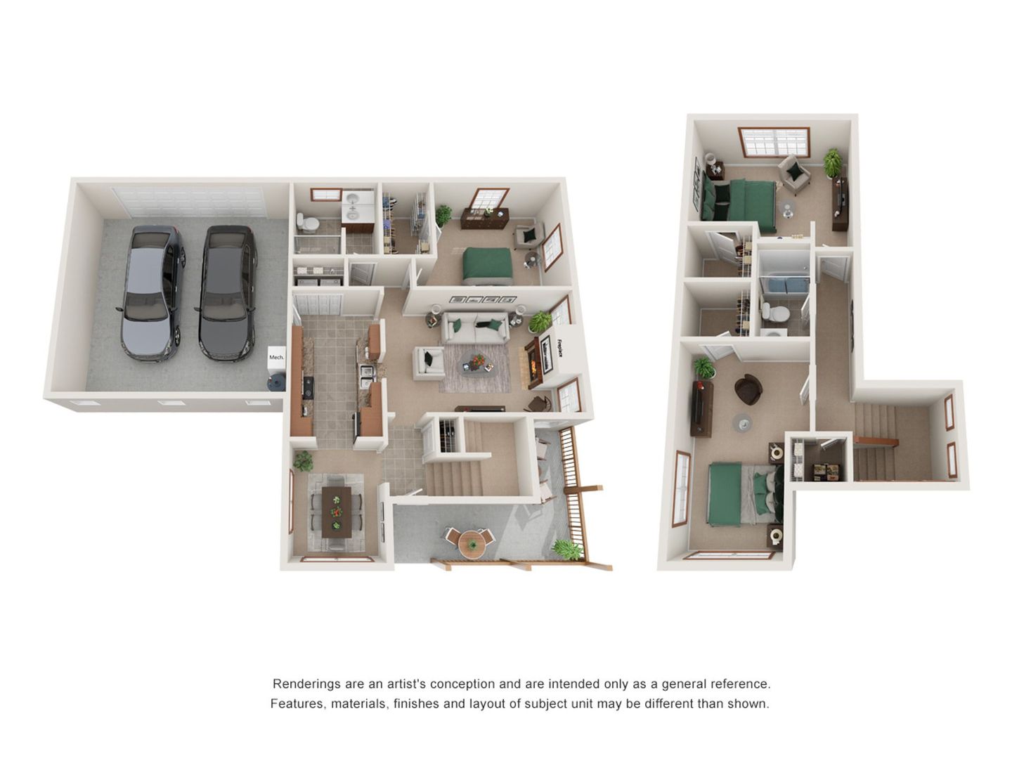One of the premier 3-bedroom apartment homes in Bloomington, the Kingston has 1750 sqft. of living space over 2 levels, with 3 bedrooms and a 2-car garage. Though this is a paired home with a single neighbor, the apartments are attached at the garage, so you’ll never have to worry about noise transfer. Other features include a gas fireplace, gourmet kitchen, and plenty of windows for natural light. Stainless steel appliances and contemporary fixtures are the icing on the cake.